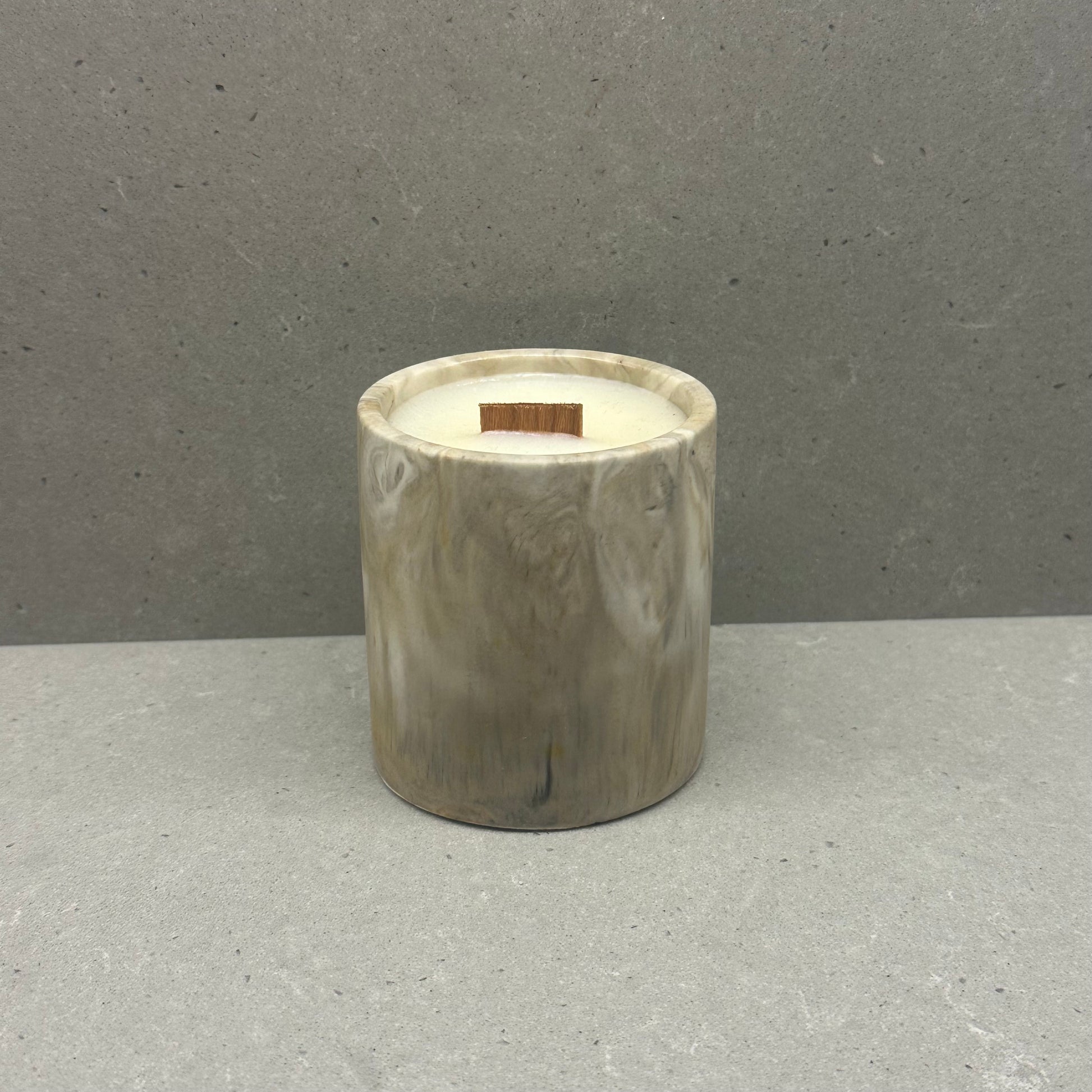 Žvakės indelis pagamintas iš Jesmonite medžiagos ir nugruntuotas akriliniu gruntu, kuris apsaugo žvakės indelį nuo vandens bei vaško poveikio. Išdegus žvakei indelį galite naudoti ir toliau arba užsisakyti žvakės papildymą pasirinkto kvapo.